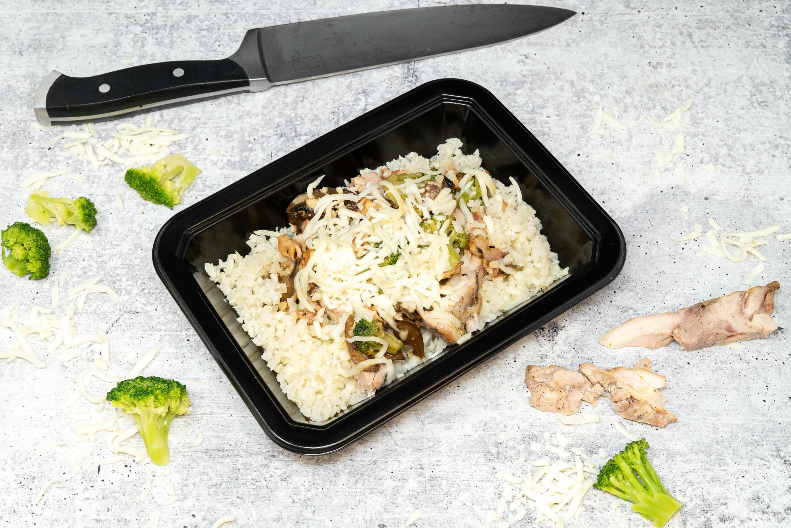 INGREDIENTS: Cauliflower Rice, Chicken Thighs, Broccoli Floret, Shredded Mozzarella Cheese [Low Moisture Part Skim Mozzarella Cheese (Pasteurized Part Skim Milk, Cheese Cultures, Salt, Enzymes), Powdered Cellulose (To Prevent Caking), Natamycin (A Natural Mold Inhibitor)], Demi Glace de Veau Classic [[Veal Stock (Water, Roasted Veal Bones, Carrots, Celery, Onions, Tomato Paste, Parsley Stems, Garlic, Rosemary, Thyme, White Peppercorns, Bay Leaves), Demi-Glace Sauce Mix(Food Starch-Modified, Dried Beef Stock, Dextrose, Beef Fat, Salt, Tomato Powder, Autolyzed Yeast Extract, Gelatin, Caramel Color, Onion Powder, Beet Powder, Xanthan Gum, Artificial Wine Flavor, Garlic Powder, Mushroom Powder, Citric Acid, Extract of Carrot, Disodium Inosinate, Disodium Guanylate, Spice Extractive, Polysorbate 80 (An Emulsifier)]], Bacon Center-cut Natural, Mushrooms, Soy Sauce, Light [Water, Wheat, Soybeans, Salt, Lactic Acid, Sodium Benzoate: less than 1/10 of 1% as a Preservative], Fresh Peeled Garlic, Extra Virgin Olive Oil, Black Pepper Ground, Salt Kosher