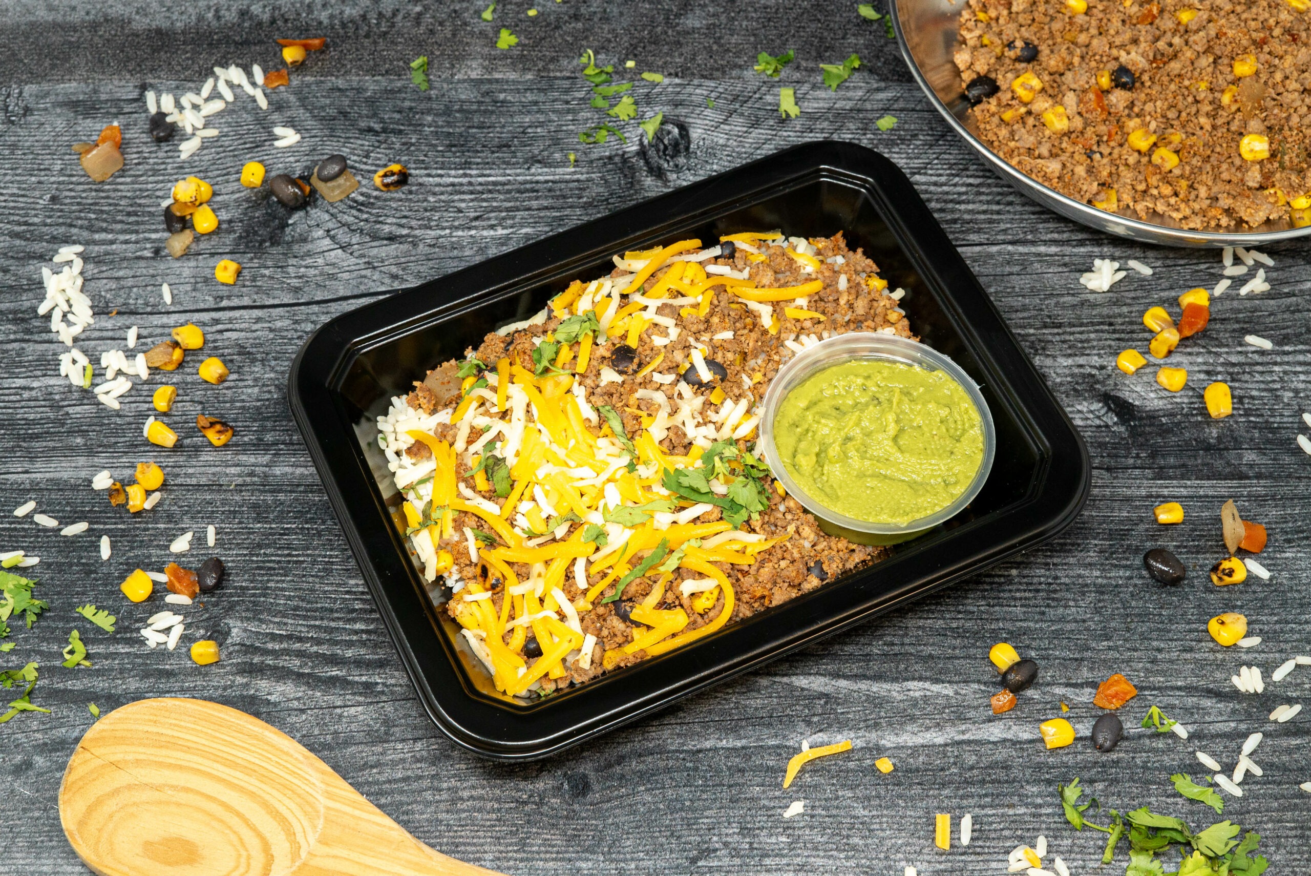 INGREDIENTS: Ground Beef USF, Water Tap, Generic Guacamole Cup [[Haas Avocado, Tomatillo, Dehydrated Onion, Sea Salt, Jalapeno Pepper, Dehydrated Garlic, Garlic, Dehydrated Cilantro, Dehydrated Jalepeno, Natural Flavor, L-Cysteine (Antioxidant)]], Fiesta Black Bean & Corn [[Sweet Corn, Cooked Black Beans, Tomato, Onion, Green Bell Pepper, Red Bell Pepper, Contains Less Than 2% Of Brown Sugar, Citric Acid, Dehydrated Vegetables (Onion, Bell Pepper, Garlic), Lime Juice Powder, (Lime Juice Concentrate, Modified Food Starch, Maltodextrin, Citric Acid), Natural Flavor (Including Grill And Smoke), Olive Oil, Salt, Spices, Sugar, Yeast Extract]], Perfect Parboiled Rice [Long Grain Parboiled Rice Enriched With: Iron (Ferric Orthophosphate), Niacin, Thiamin (Thiamin Mononitrate), And Folic Acid], Lime Juice, Cheese, Pepper Jack, Shredded [Monterey Jack Cheese With Jalapeno Peppers (Pasteurized Milk, Jalapeno Peppers, Cheese Culture, Salt, Enzymes), Potato Starch And Powdered Cellulose (Added To Prevent Caking), Natamycin (A Natural Mold Inhibitor)], Cheese, Mild Cheddar, Shredded [Cheddar Cheese (Pasteurized Milk, Salt, Cheese Cultures, Salt, Enzymes, Annatto Vegetable Color), Corn Starch (Anti-Caking Agent)], Cilantro Fresh, Chili Powder, Kosher Salt [Salt, Yellow Prussiate Of Soda], Black Pepper, Ground Cumin, Fresh Peeled Garlic, Paprika [Paprika, Silicon Dioxide], Granulated Garlic, Onion Powder, Crushed Red Pepper Flakes, Oregano Dried Leaves